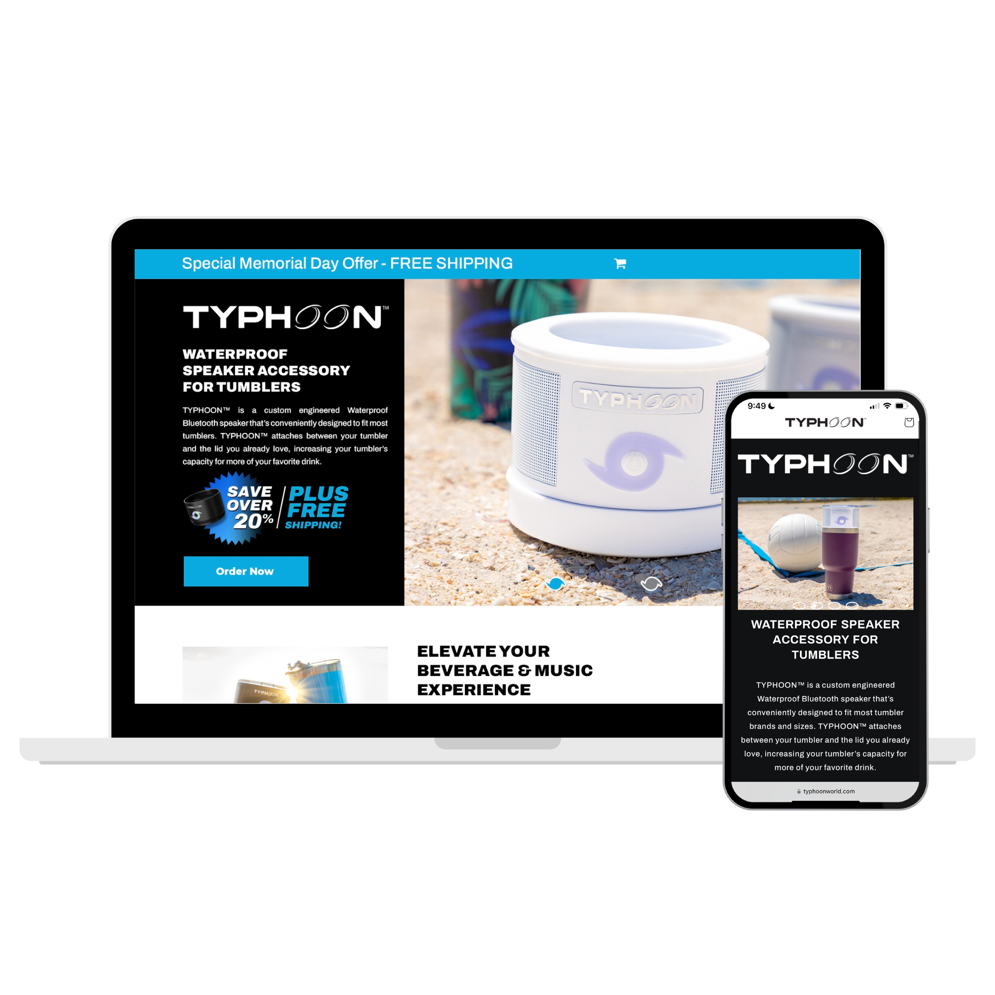 TYPHOON™ is a weather-resistant waterproof Bluetooth wireless speaker that’s conveniently designed to universally fit most tumblers. It’s compatible with leading brands including Yeti, Tervis, Swig, Ozark Trail, Hydro Flask, Igloo, SIC, Reduce and many more, offering consumers versatility and convenience. TYPHOON™ is the first and only tumbler speaker accessory that offers rich and loud 360° sound. Consumers simply attach the tumbler between their tumbler and lid, increasing their tumbler’s capacity by 4oz and adding impeccable sound for over 6 hours. TYPHOON™ offers you the freedom to live, work, drink and listen to music wherever you are, or wherever you’re going.