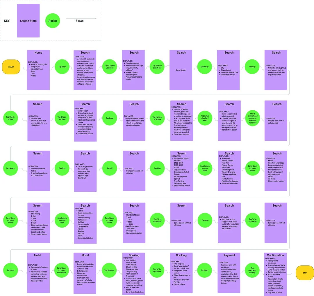 The flow shows the path a user will take to complete a task. This task is to book a hotel room. The flow shows this task from the home screen all the way to the payment confirmation screen.